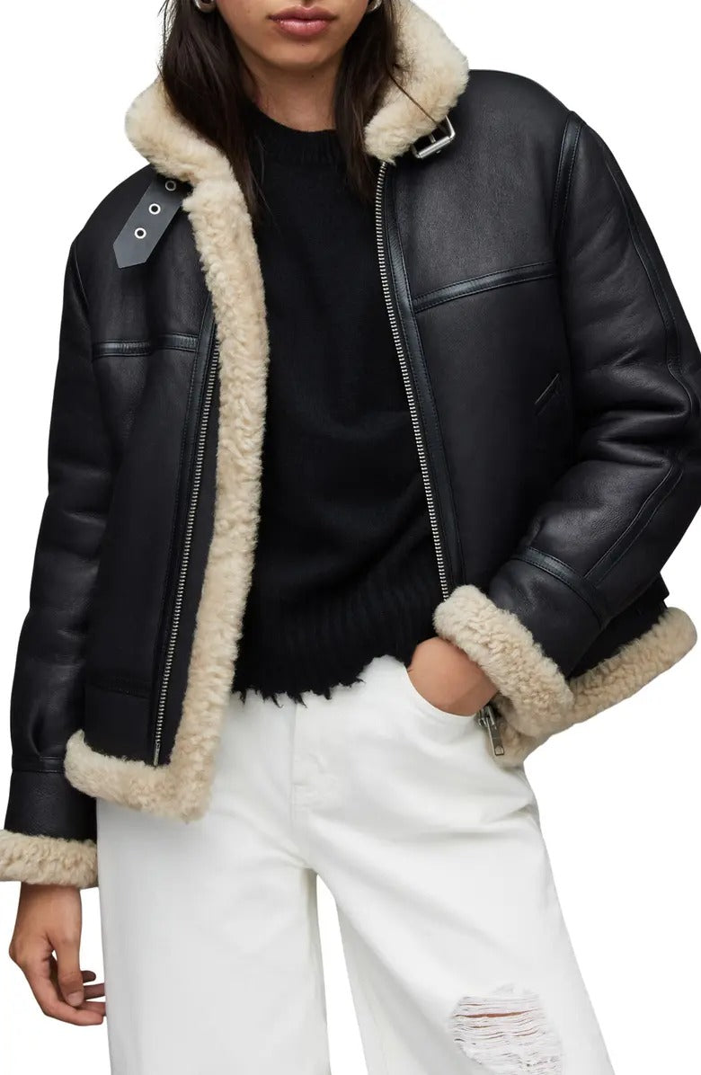 The B-3 Aviator RAF Black Shearling Leather Jacket brings timeless aviator style to your wardrobe. Made from high-quality leather and lined with plush shearling, this jacket offers both warmth and durability. Its iconic RAF design, with a wide shearling collar and adjustable straps, ensures maximum comfort during cold weather. Shop the best aviator shearling jacket at discounted price with free shipping.