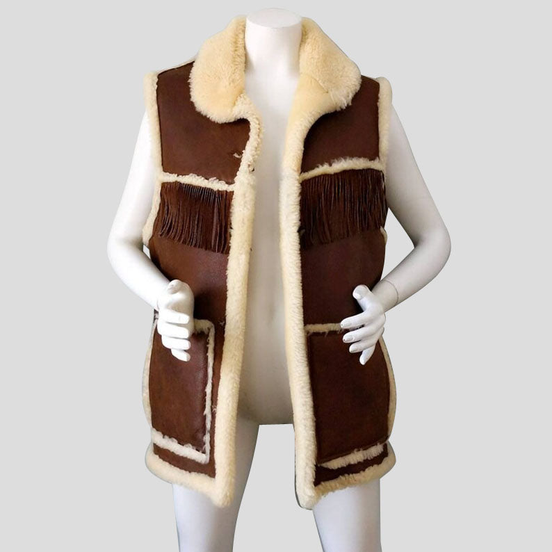 This luxurious shearling vest will keep you warm and stylish in colder weather. Its brown leather finish and fringe detail make it a perfect addition to any bohemian-inspired look. Crafted from comfortable, lightweight material, this vest is an ideal choice for staying warm in style.