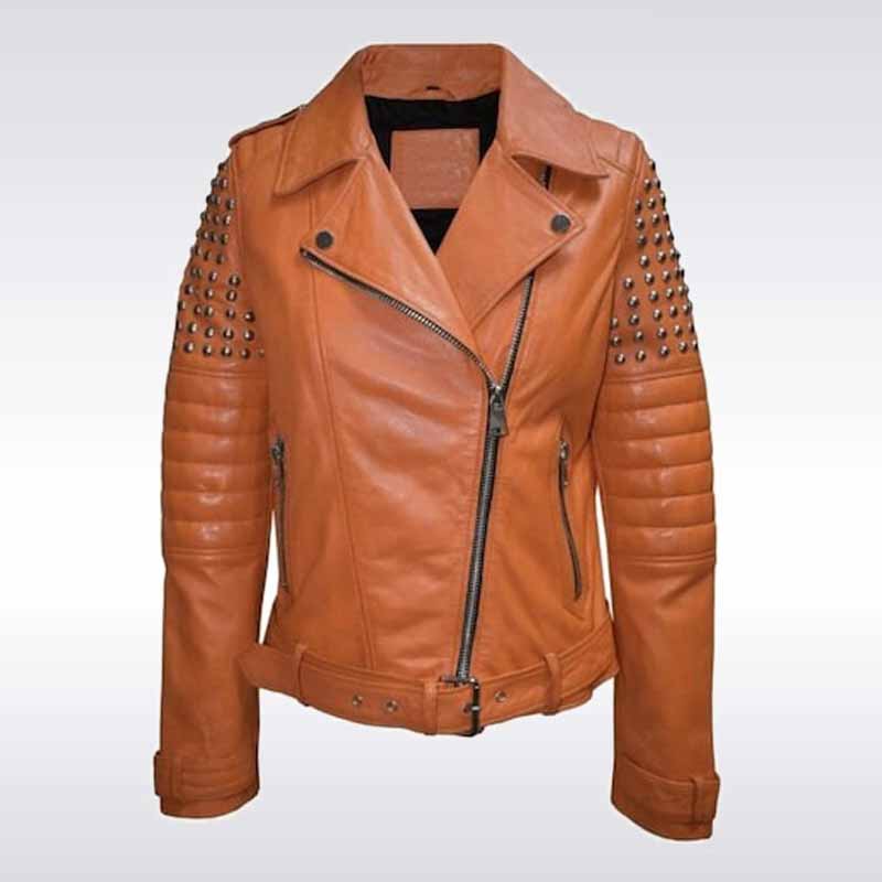 Add fierce attitude to your wardrobe with this brown studded leather motorcycle jacket, crafted from genuine cowhide leather for a tough yet luxe finish. Each silver spike stud is hand-applied, giving it an authentic punk-rock edge. The belted waist flatters your figure, while the zip closure, turn-down collar, and open-hem cuffs with straps deliver that bold Brando vibe. Whether you’re riding or just owning the street, this jacket keeps you looking powerful.