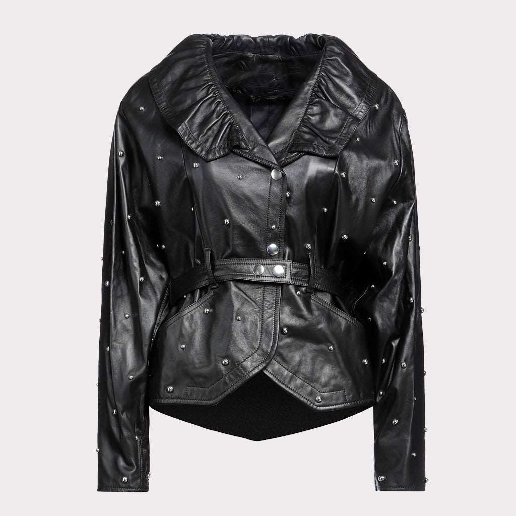This chic black leather jacket features edgy silver studs for an effortlessly trendy look. Crafted from premium leather, it is designed to last through any season while keeping you comfortable and stylish.