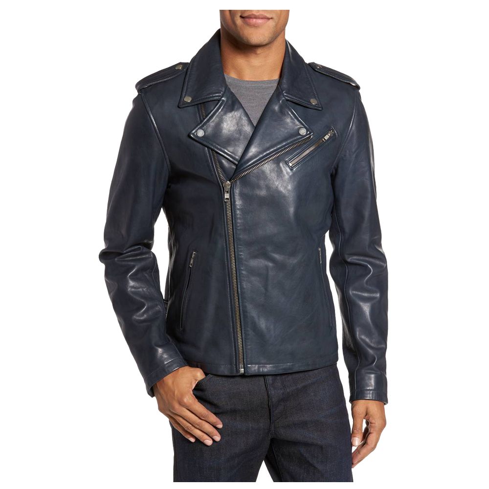 Blue Biker Leather Jacket The most touching and swaying collection of Jacket Hunt?s gallery is the stock of our Men’s Biker Jackets. You will not regret selecting at least one of the moto-style leather jackets out of our collection. Leather Biker jackets, specially designed with amazing rocking chained zippers and fine cuts.