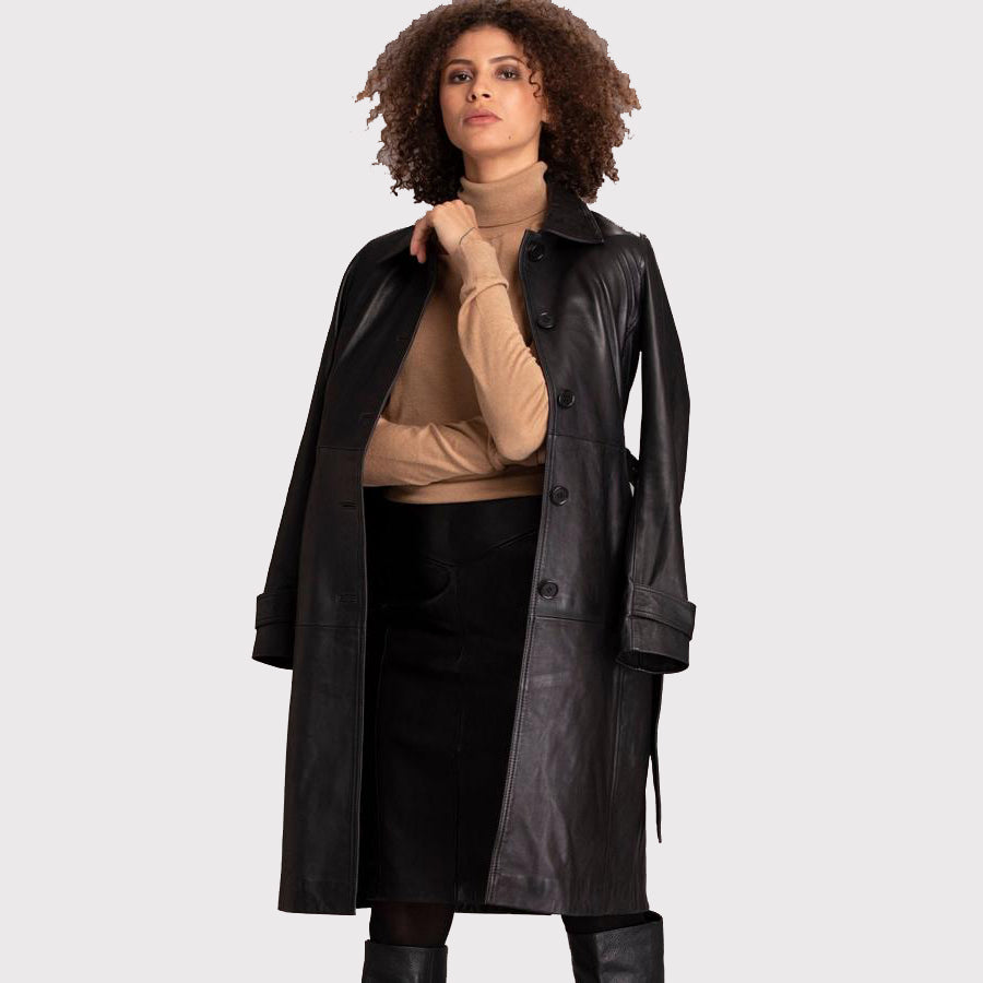 This expertly designed black lambskin leather coat is perfect for a modern woman, providing luxurious comfort and classic style. Featuring a timeless silhouette, this coat is sure to become your go-to piece.