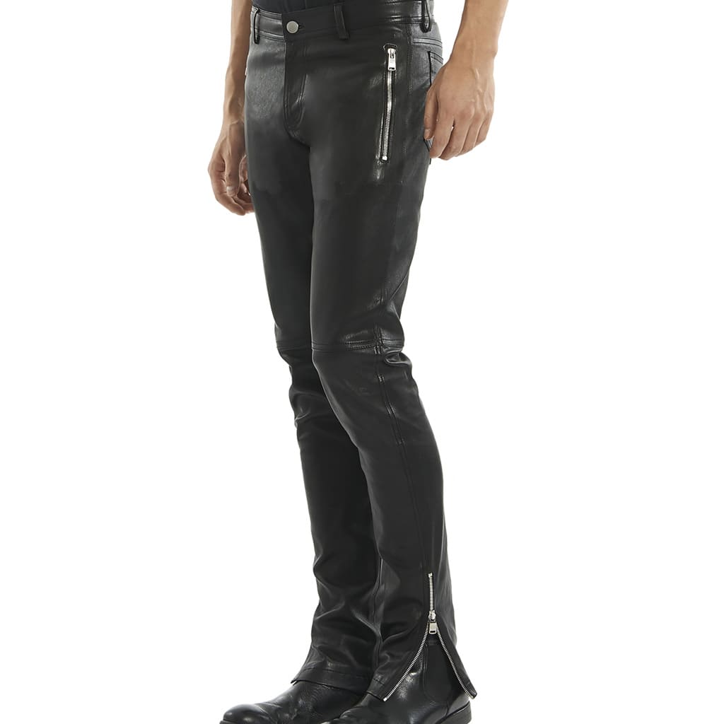 This Men New Style Leather Biker Pant is crafted from premium lamb skin leather and features masculine ribbing at the knee for a sleek, fashionable look. Its low waist cut, zip detail at the pocket and ankle and button fastening with belt loop make for a stylish, comfortable fit. Two back pockets provide convenient storage.