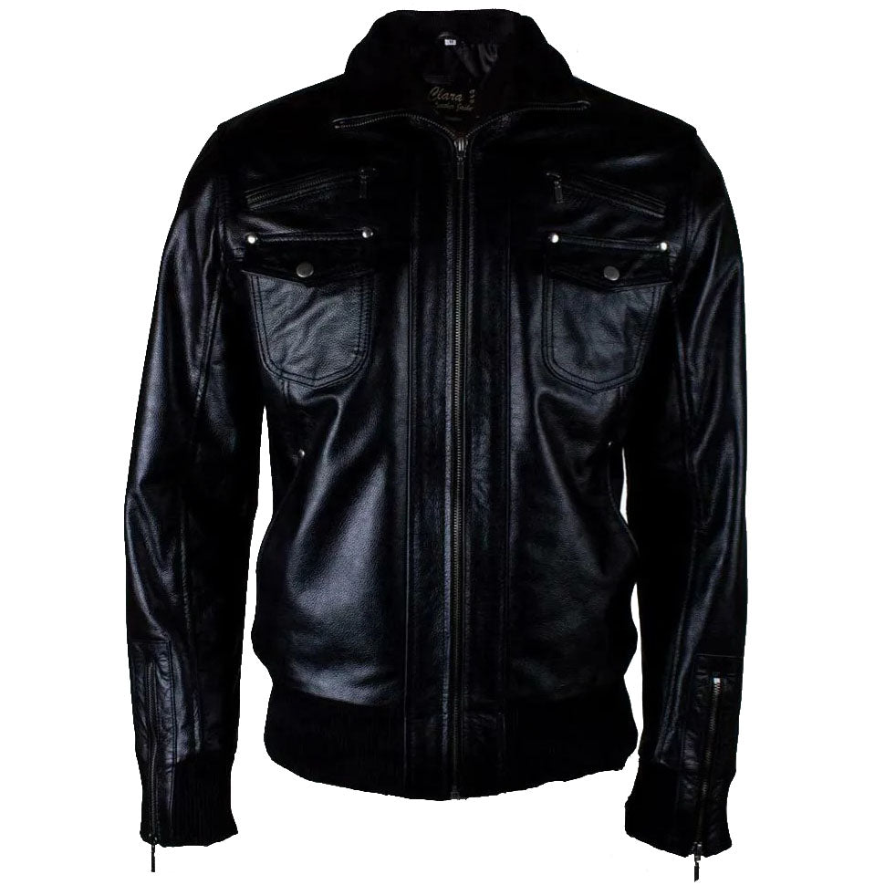Men’s Black Fashion Genuine Leather Bomber Jacket with 6 Front Pockets