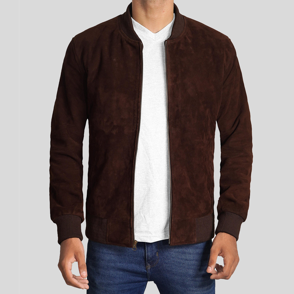 Men’s Dark Brown Suede Leather Bomber Jacket – Classic