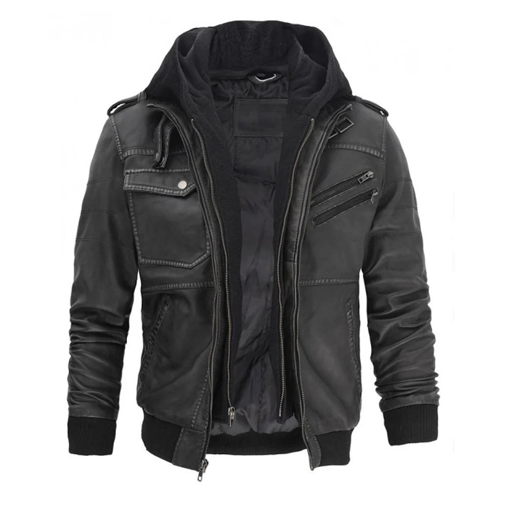 Elevate your style with the Men?s Grey Hooded Bomber Leather Jacket a perfect blend of modern design and classic bomber appeal. This hooded leather jacket is versatile and comfortable, making it an ideal choice for any casual outing. The detachable hood adds a contemporary twist, while the high-quality leather ensures durability and a sleek look. Looking for something classic? Explore our aviator jacket mens collection.