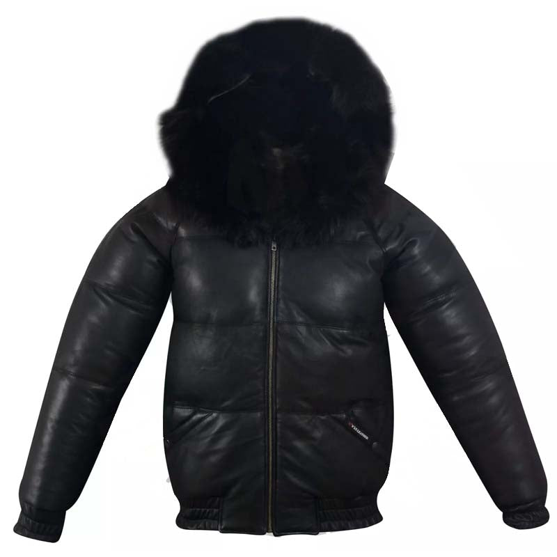 Men’s Puffer Bomber Sheepskin Leather Jacket with Removable Raccoon Fur Collar & Hood