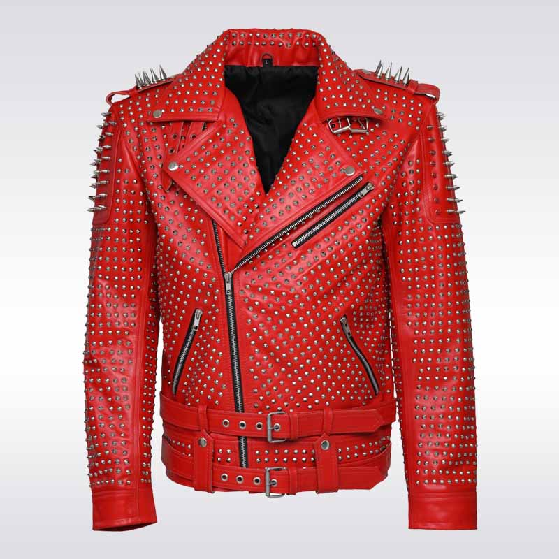 Command attention with the Men?s Red Spiked Leather Jacket, a fierce fusion of punk rebellion and premium craftsmanship. Hand-studded with metal rivets and spikes, this bold biker jacket is cut from full-grain leather, offering unbeatable durability and standout edge. Whether you’re rocking the stage or the streets, this piece is made to turn heads and last for years.