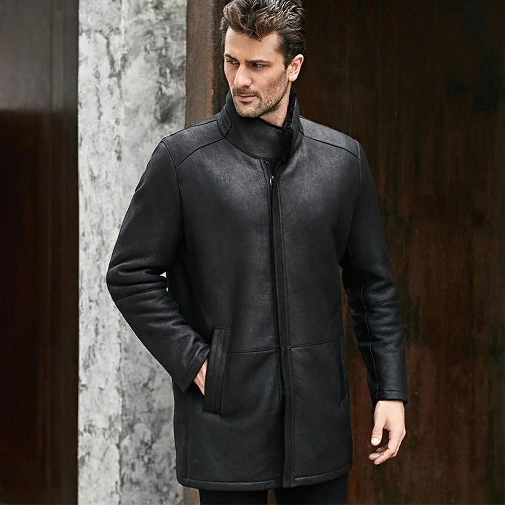 Be the first to review “Men’s Stand Collar Black Shearling Long Coat”