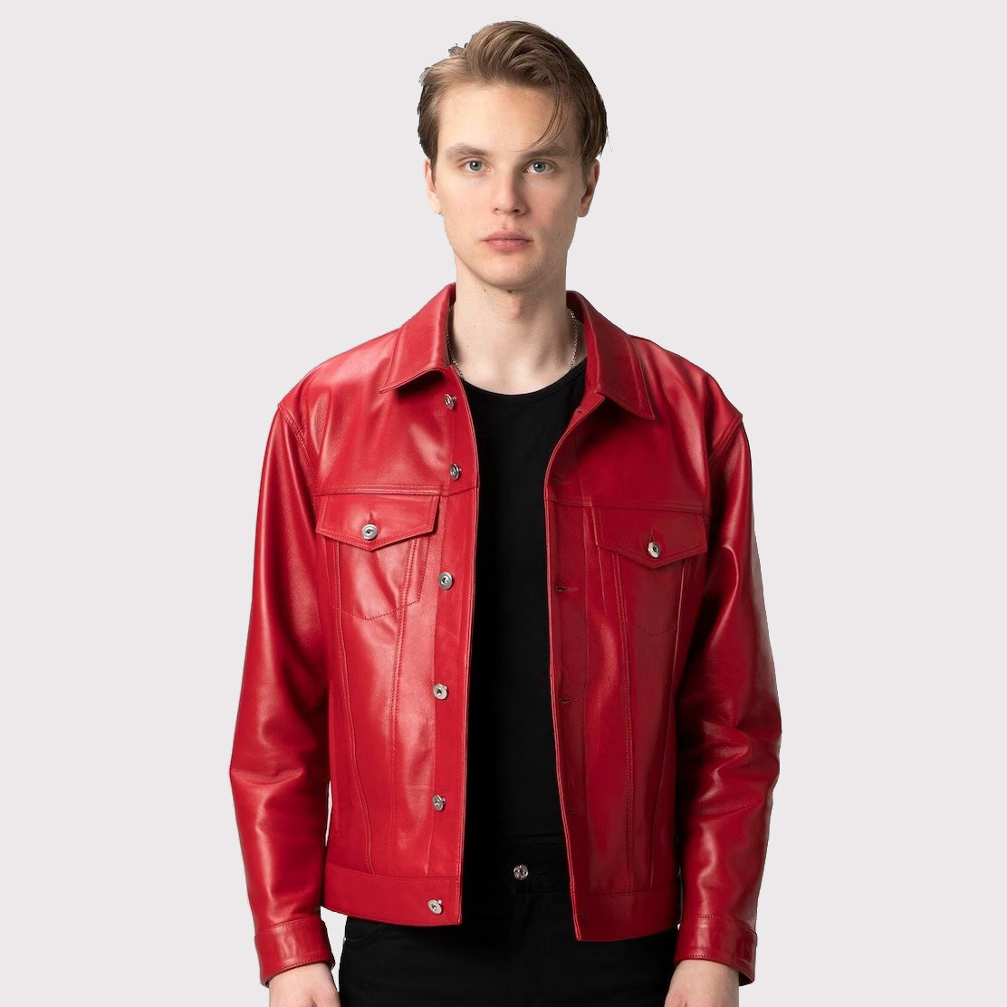 This Premium Red Lambskin Leather Trucker Jacket for Men is perfect for any man’s look. It features a soft and luxurious lambskin leather exterior that provides a polished style and comfortable fit. With this jacket, you’ll stay warm and stylish all season long.