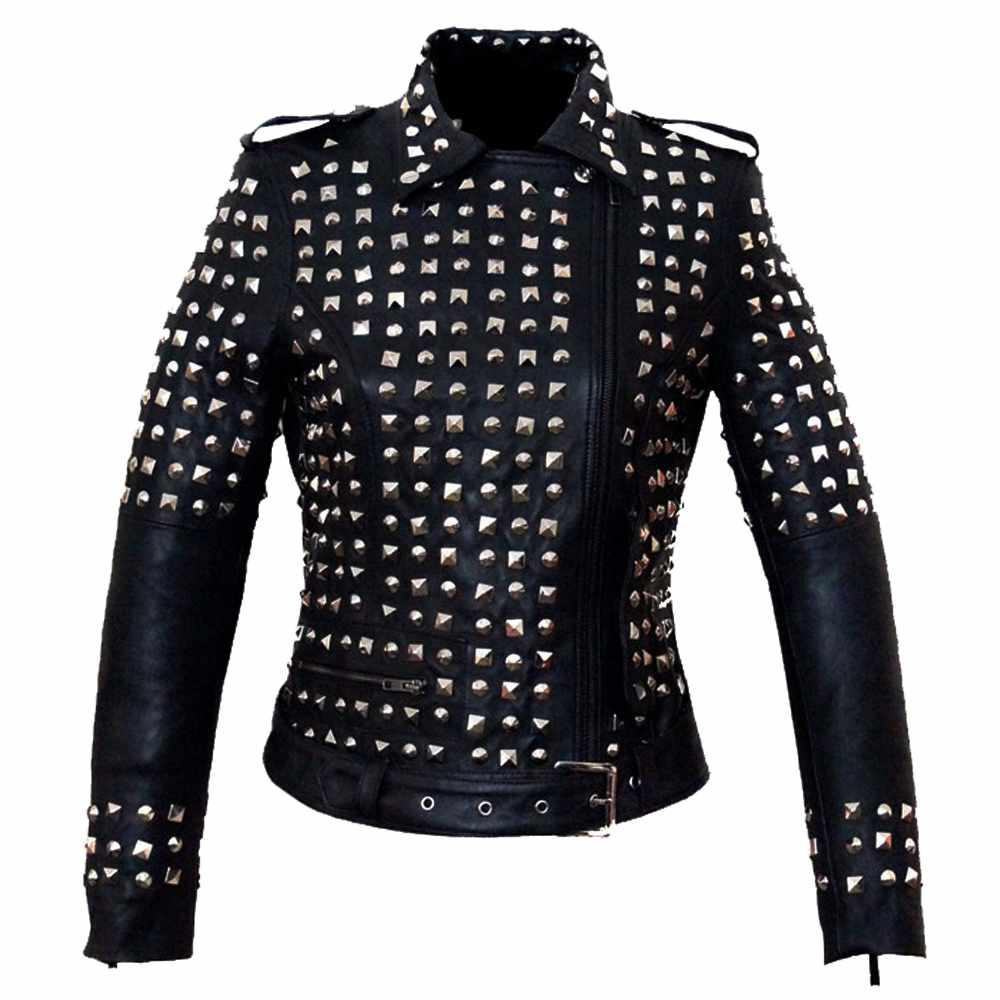 Punk Women Studded Biker Black Leather Jacket
