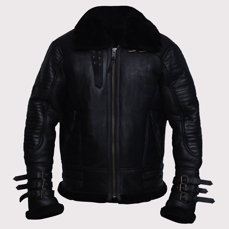 This Stylish Men’s Black Biker Shearling Jacket is designed to keep you looking fashionable in cooler weather. It features soft and warm shearling material to keep you comfortable and protected from the elements. The sleek black design is classic and timeless. Looking for something classic? Explore our aviator jacket mens collection.
