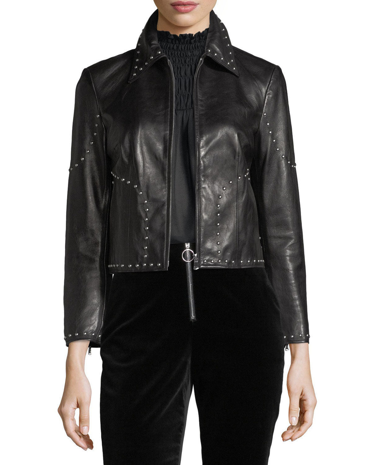 Stylish Studded Cropped Front Zip Women’s Genuine Lambskin Leather biker Jacket
