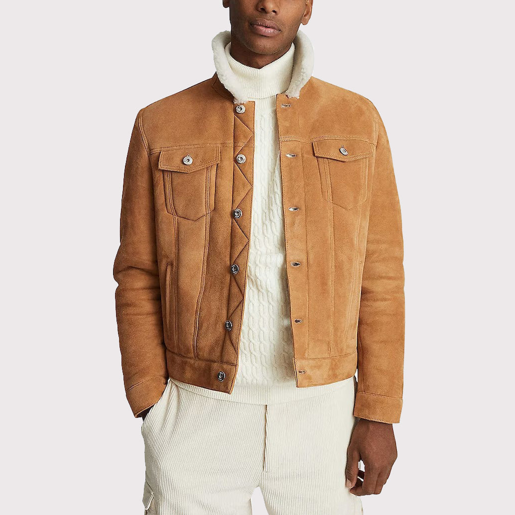 Impress with this stylish suede leather jacket, featuring a soft faux shearling collar for maximum warmth and coziness. Perfect for all fashionistas this season.