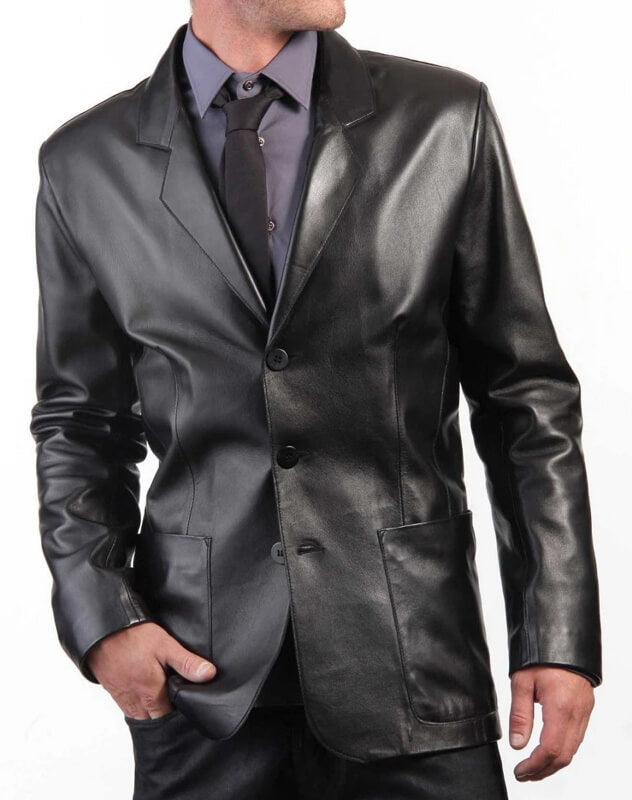 This three-button blazer-style black leather coat for men merges classic sophistication with modern appeal. Tailored from premium leather, it features a sharp blazer silhouette with a sleek, formal finish. Perfect for both business and casual outings, this coat offers versatility and comfort. Whether you?re dressing up or down, it adds an edge to your wardrobe. Buy the best three-button black leather coat at discounted price with free shipping.