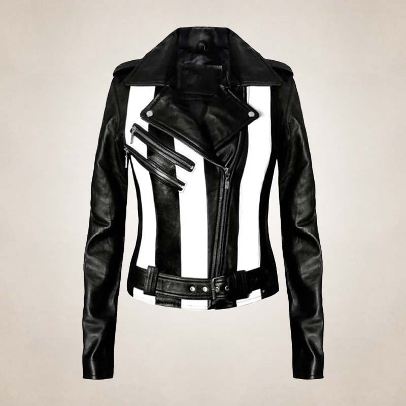 Make a bold entrance with this black and white striped leather biker jacket for women?a standout piece that blends classic moto edge with sleek street style. Designed for fashion-forward women, this jacket adds a touch of rebellion to any outfit. Crafted for comfort and attitude, it?s perfect for city nights, casual outings, or cool-weather rides. Get noticed, stay warm, and ride in effortless confidence with a jacket that turns heads and feels as good as it looks.
