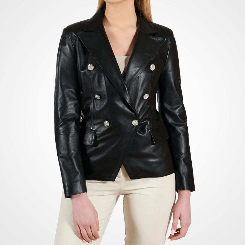 Step up your style with the Women?s Black Double-Breasted Leather Coat from Jackets Kingdom. Made from premium-quality leather, this coat features a sleek double-breasted front for a timeless and sophisticated look. The tailored fit and belted waist enhance your silhouette, making it perfect for both casual and formal wear. A soft inner lining ensures all-day comfort, while durable stitching adds lasting quality. Whether you’re heading to work or a night out, this black leather coat is a wardrobe essential for effortless elegance.