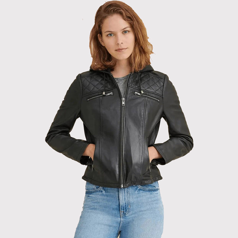 Women’s Black Leather Hooded Biker Jacket