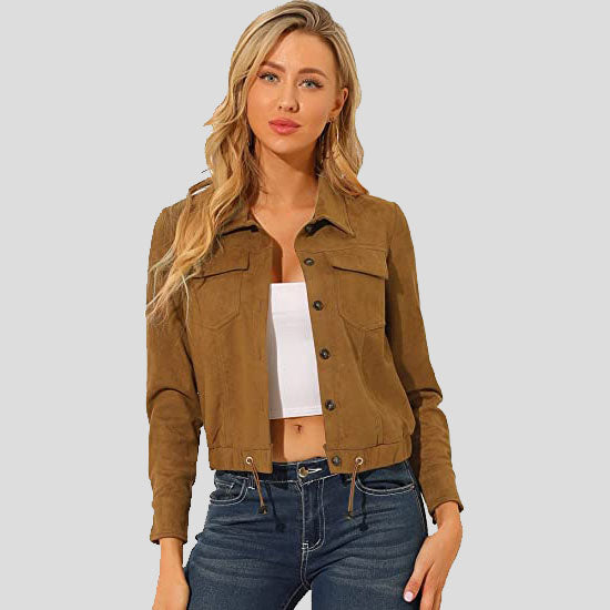 Women’s Brown Suede Point Collar Button Down Cropped Moto Biker Jacket
