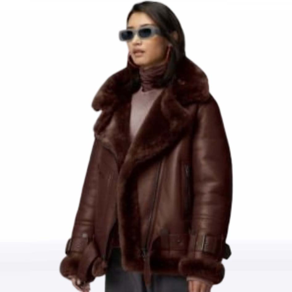 Wrap yourself in vintage luxury with the Women?s Dark Brown Belted B3 Shearling Leather Jacket. Crafted from premium lambskin leather and finished with plush faux shearling, this aviator-inspired jacket delivers timeless style, warmth, and sophistication. The belted waist, strapped cuffs, and multiple zip pockets make it the perfect blend of elegance and practicality for cold-weather adventures.