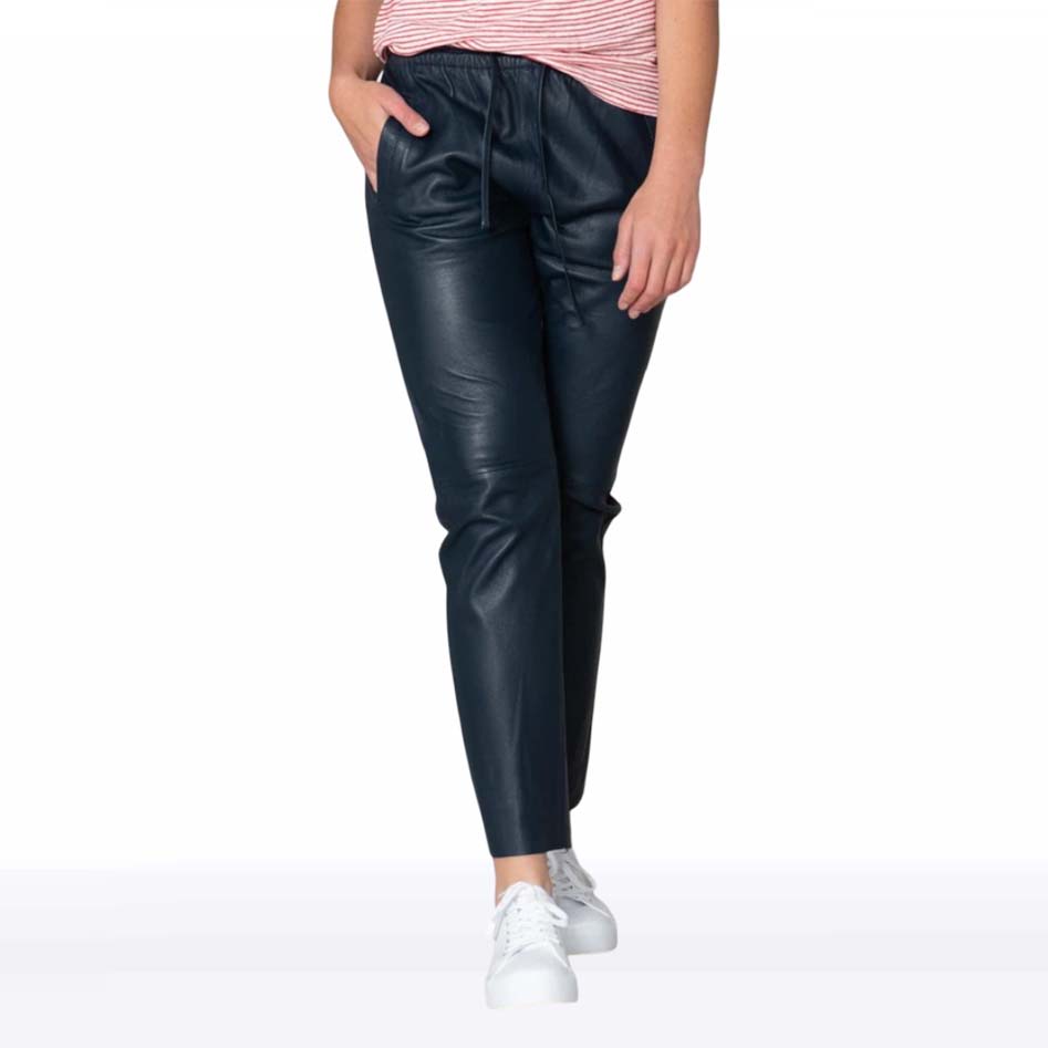 Step into bold luxury with the Women’s Navy Blue Lambskin Leather Joggers ? a fierce fusion of comfort, statement style, and premium quality. Made from 100% genuine lambskin leather, these jogger pants offer a sleek silhouette with a soft, flexible feel that moves with you. The rich navy tone adds sophisticated edge, while the lace-up front and elastic waist give it that ultra-modern streetwear vibe. Whether you’re dressing up or staying casual, these leather joggers deliver effortless cool and high-end confidence?from day to night.