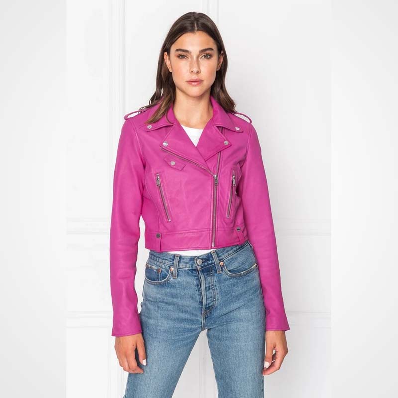 Brighten up your wardrobe with the Women’s Pink 100% Lambskin Leather Biker Jacket from Jackets Kingdom. Made from genuine lambskin leather, this jacket offers a buttery-soft touch and a flattering biker silhouette. The vibrant pink color adds a bold yet elegant twist to your everyday style. Lightweight, durable, and designed for confident riders and fashion lovers. Shop now at Jackets Kingdom and embrace standout street style.