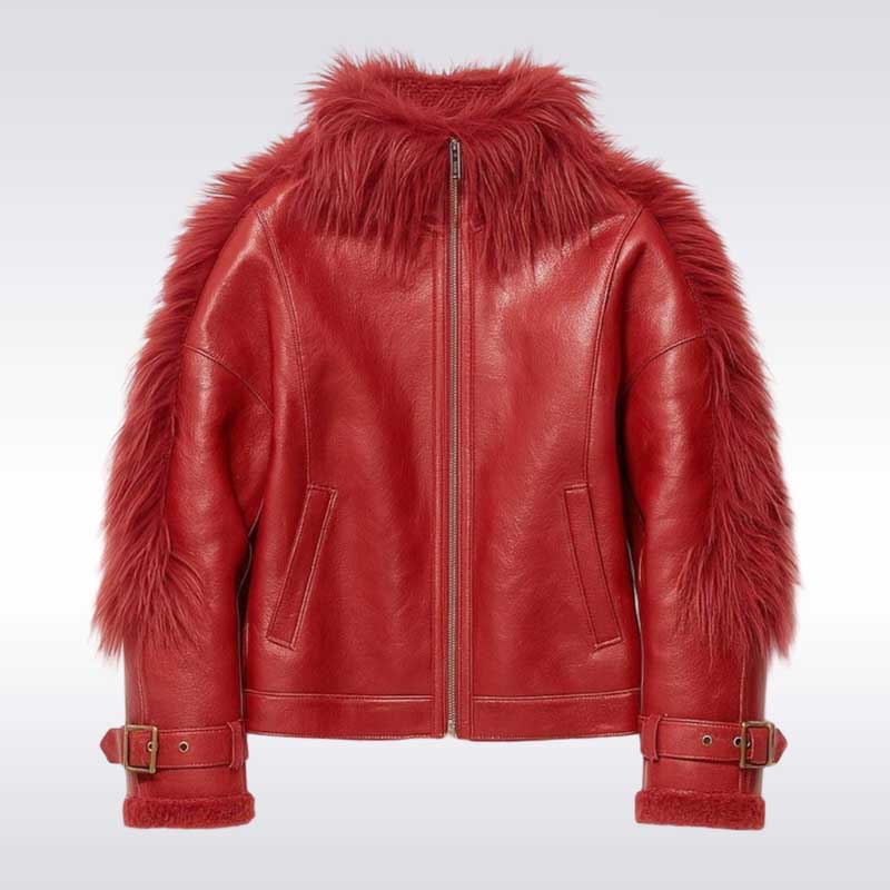 Turn every head this season with the Women?s Red Faux Fur Shearling Leather Jacket, a bold aviator-style coat designed for warmth and statement-making style. Crafted from premium leather with luxe faux shearling trim, this shearling jacket for women features a dramatic fluffy collar, cozy inner lining, and adjustable belt cuffs for a perfect fit. Ideal for winter fashion, festivals, and gifting, it?s the ultimate mix of luxury and edge.