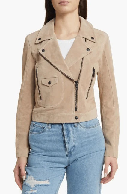 Elevate your style with the Women’s Tan Beige Suede Biker Leather Jacket. This jacket perfectly blends the edgy biker aesthetic with the soft, luxurious feel of suede in a warm tan beige hue. Designed for both comfort and style, it features a flattering fit and classic biker details like asymmetrical zippers and a tailored waist. Whether for casual wear or a night out, this jacket adds a chic, sophisticated touch to any outfit. Buy the best suede leather biker jacket at discounted price with free shipping.