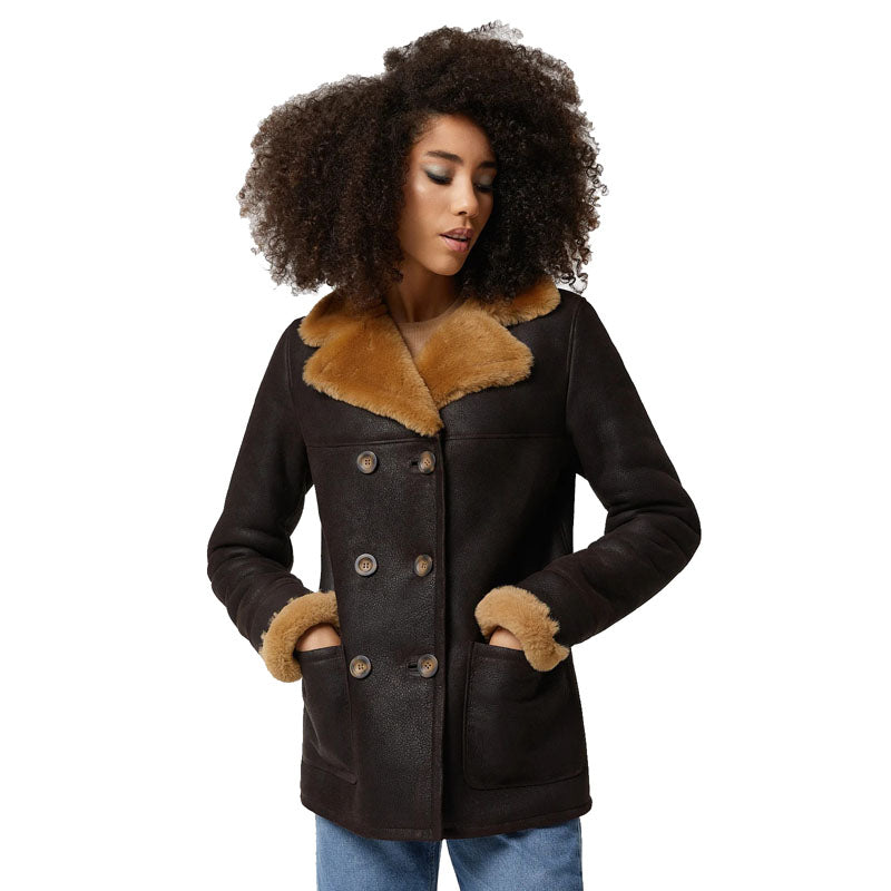 Women’s Washed Brown Shearling Peacoat with Ginger Fur